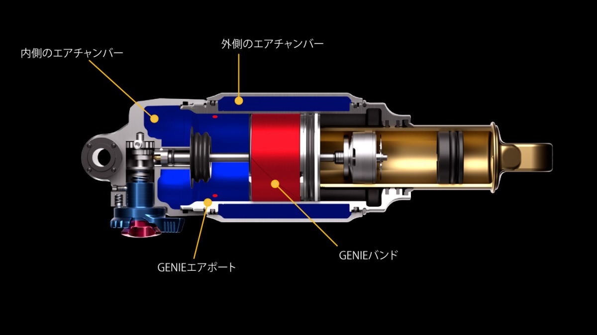 その鍵を握るのが特許出願中のGENIE(ジーニー)エアショック・テクノロジー。コイルショックのような作動感と操作性、標準的なエアスプリングより優れたボトムアウト耐性、軽快な走りを実現できるチューニング可能なプラットフォームを可能にする画期的なテクノロジーです。