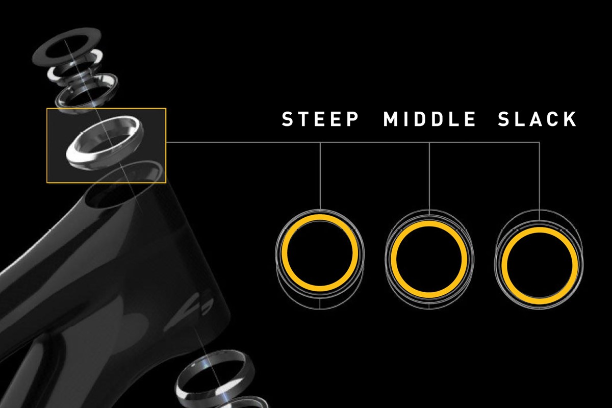 ヘッドアングルは特殊な偏心円型のアッパーヘッドセットカップを回転させて、63度から65.5度にセットできます。