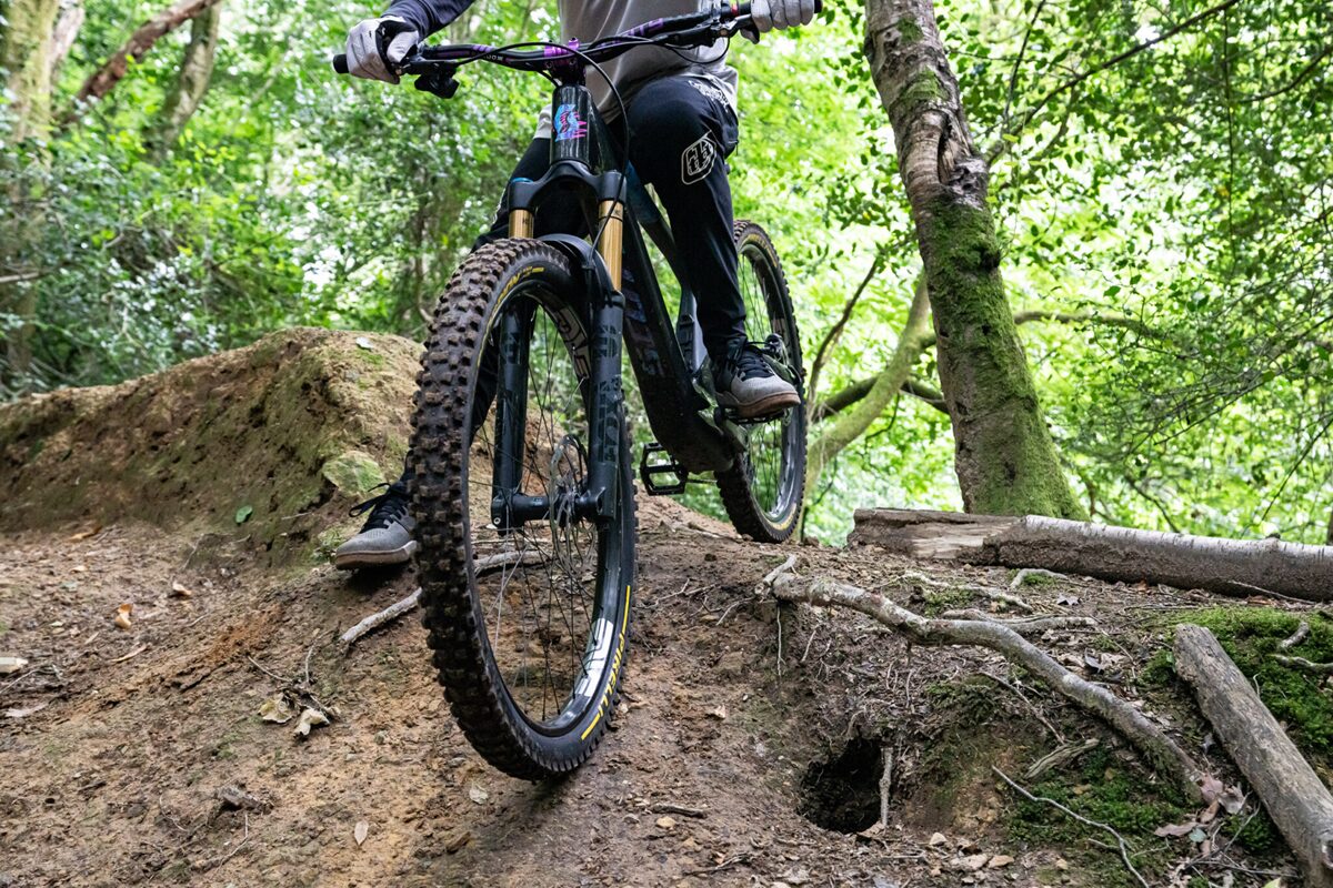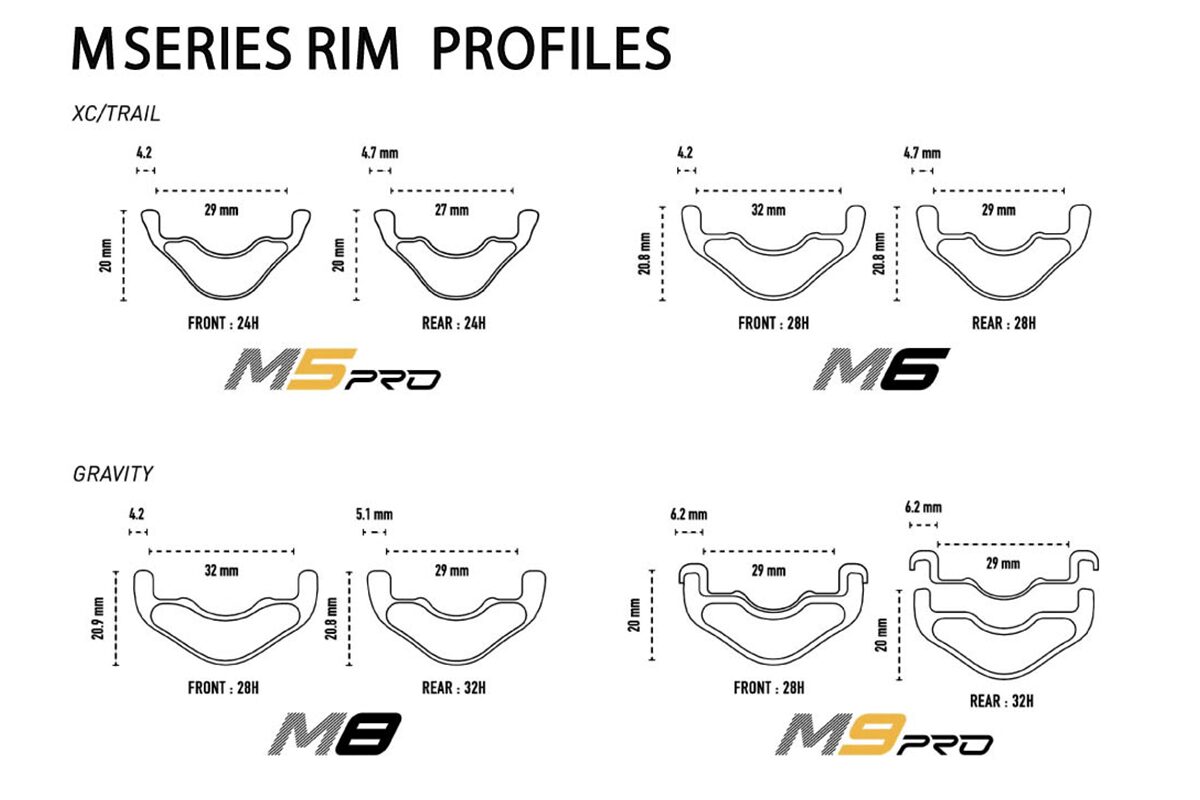 前後で役割が変わるため前後でリム形状を変更。フロントのリム幅が若干広がることで、タイヤボリュームを増やすことができ低圧でグリップ力や振動吸収性を高めます。