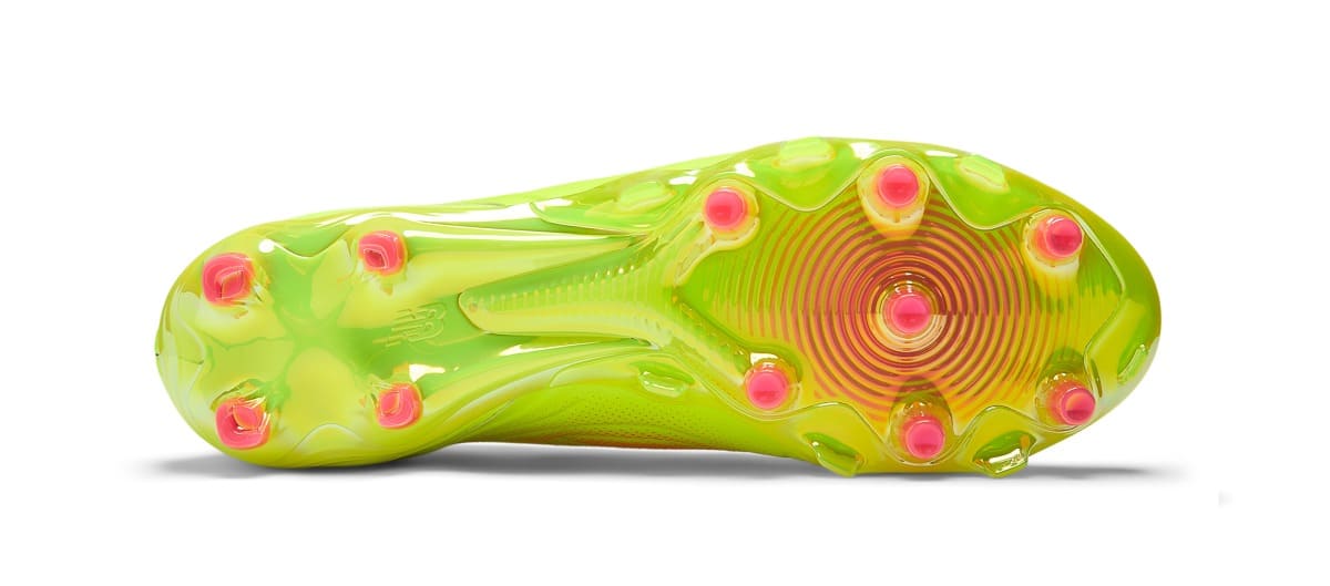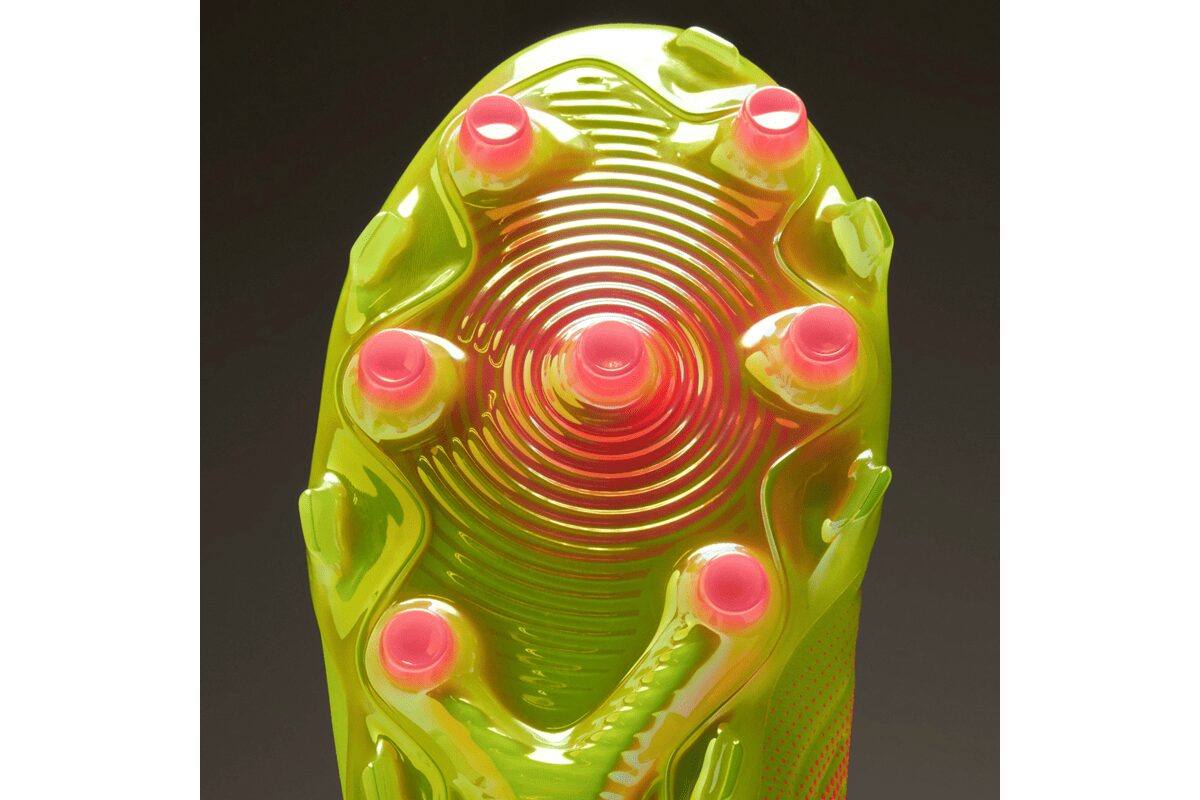 円錐形のスタッド構造と前足部のTPUアングルリムスタッドを備え、縦横無尽なプレーでも360度あらゆる方向への牽引力と安定した足元をサポート。