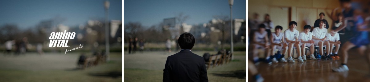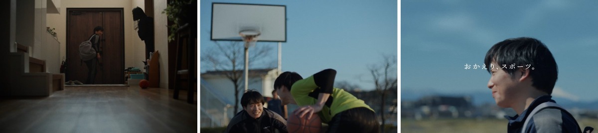 そして、休日の朝、妻に見送られて「アミノバイタル®️」を持って家を出ると、バスケットボール仲間が待つ公園へと向かう。仲間との練習を楽しんだ後、帰途につく笑顔に「おかえり、スポーツ」の文字が重なり、スポーツで新たな挑戦を始めるすべての人々の背中を押す 。