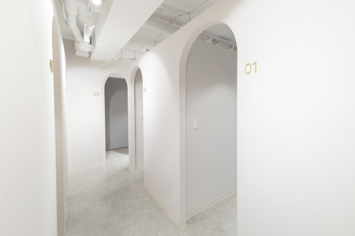 店舗内装は、白とグレーを基調にしたミニマルでスタイリッシュなデザインで、アーチ型の通路が柔らかな印象を与え、個室は清潔感と落ち着きを兼ね備えた空間設計となっています。